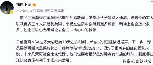 目前距离NBA选秀大会还有10天左右时间,单独试训已经接近尾声。下一步,球员要做可能就是保持状态,静静等待“命运的安排”。但对于杨瀚森的经纪团队来说,未来几天可能会比较忙碌,他们也要考量那些对瀚森有兴趣的球队,到底哪些球队会真正有利于小杨未来发展。