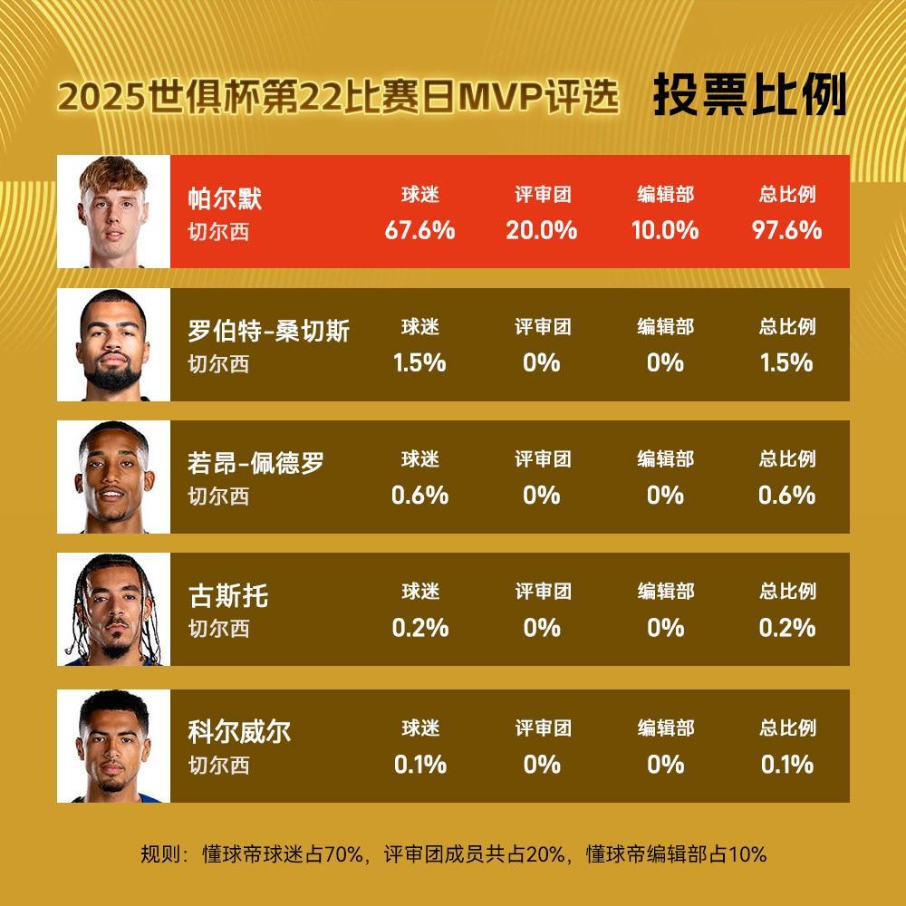 球迷朋友们大家好,欢迎来到懂球帝X咪咕2025世俱杯每日MVP评选。天下无不散之筵席,2025世俱杯也走到了最后一个比赛日,要跟各位球迷朋友们说再见了。第22个比赛日,也就是决赛日中,切尔西3-0完胜大巴黎夺冠,而帕尔默凭借独造3球的完美表现,以97.6%的本届世俱杯最高得票率获评今日世俱杯MVP!在决赛上半场中,帕尔默的表现非常活跃。第8分钟,他一脚推射稍...